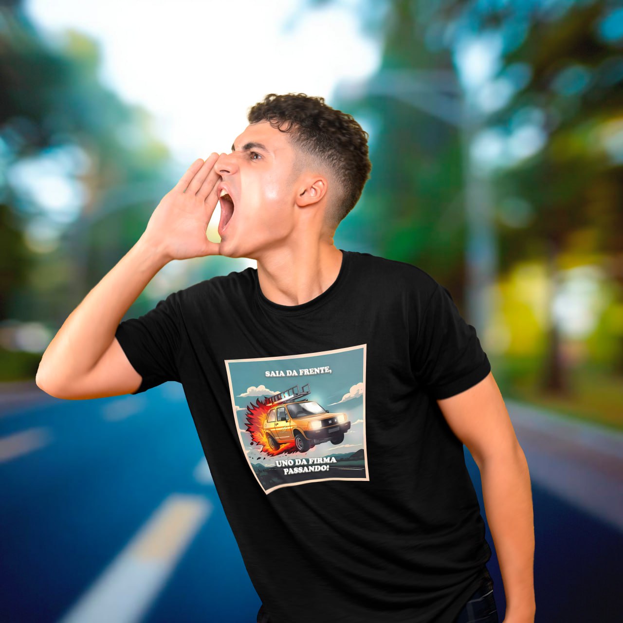 Estampa divertida e moderna, criada em DTF para um acabamento duradouro e cores vibrantes. A frase “SAIA DA FRENTE, UNO DA FIRMA PASSANDO!” garante bom humor e personalidade para o seu look.